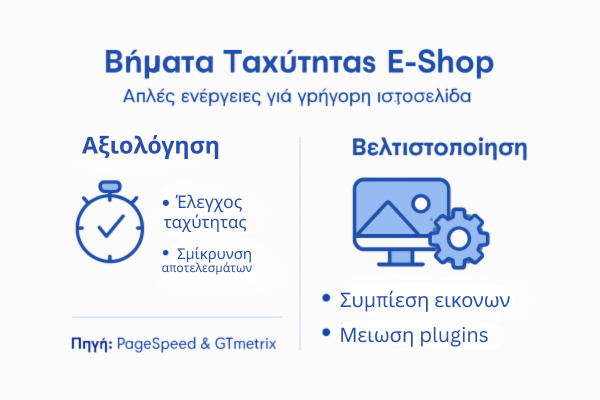 | 1. Αξιολογήστε τις επιδόσεις της ιστοσελίδας | Χρησιμοποιήστε εργαλεία όπως το PageSpeed Insights για να αναλύσετε την ταχύτητα και τη λειτουργικότητα του e-shop σας. |